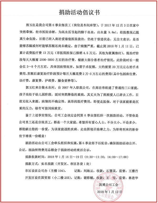 一方有難,八方支援。我公司第六事業(yè)部員工郭玉紅(崗位是車間庫(kù)管)于2017年12月3日在家中突然暈倒,經(jīng)市醫(yī)院診斷,為高血壓引起的腦干出血,經(jīng)搶救現(xiàn)已脫離生命危險(xiǎn),目前已轉(zhuǎn)入廊坊愛(ài)德堡醫(yī)院救治,仍處于昏迷狀態(tài),無(wú)自主意識(shí),是否能夠蘇醒或何時(shí)能夠蘇醒還無(wú)法判斷。郭玉紅來(lái)自衡水農(nóng)村,自2007年入職我公司,在廊坊市組建了普通的三口家庭,孩子尚處于幼兒園階段,面對(duì)突然降臨的重病,其丈夫?yàn)榱苏疹檺?ài)人已辭去工作,目前無(wú)收入來(lái)源。不論經(jīng)濟(jì)層面還是精神層面,病情的不確定性、高昂的醫(yī)療費(fèi)用,對(duì)于該家庭都是極其沉重的壓力,極有可能因病致貧。