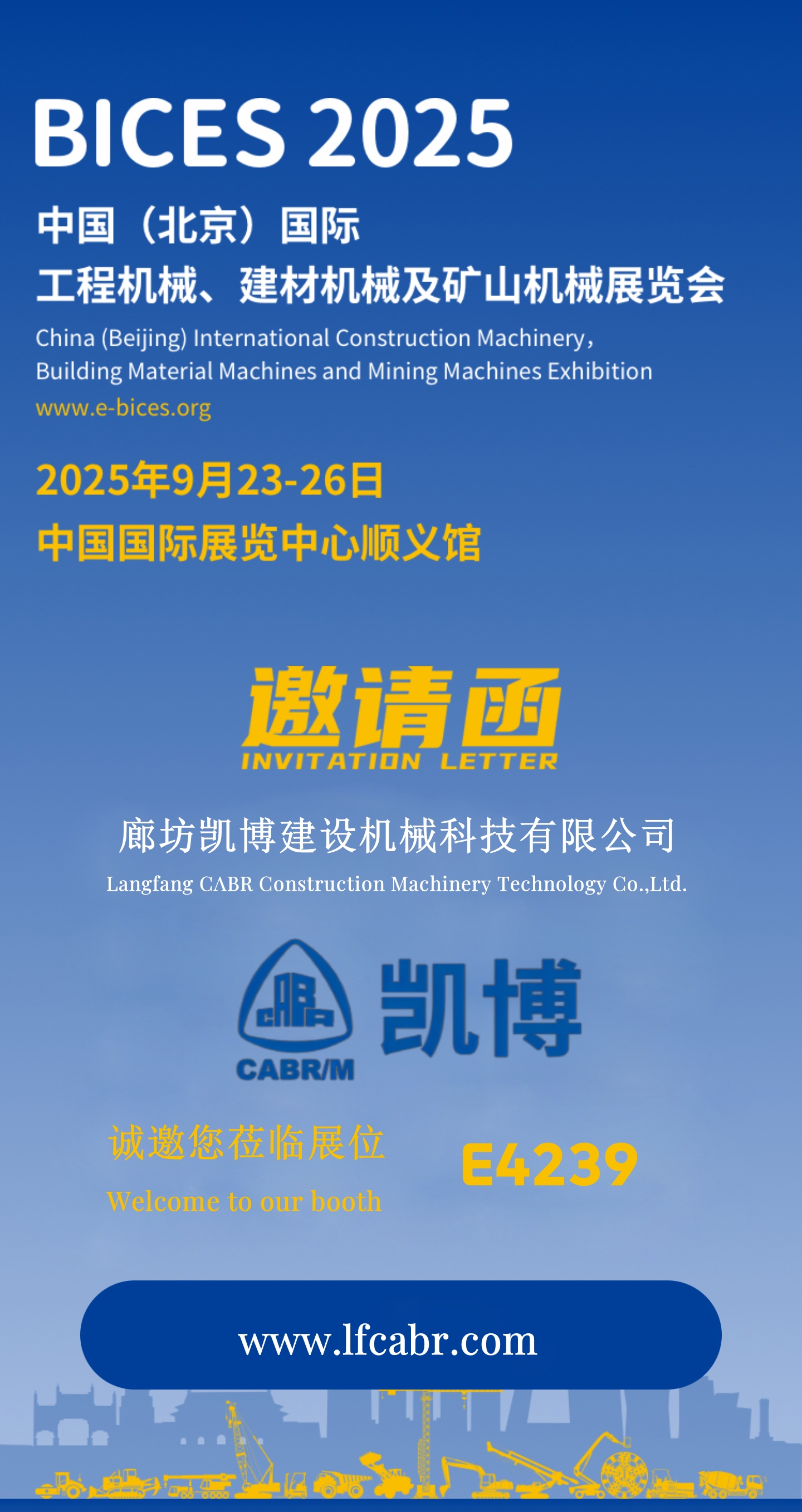 ? 中國(北京)國際工程機械、建材機械及礦山機械展覽會(BICES 2025)將于2025年9月23-26日在中國國際展覽中心順義館舉辦。廊坊凱博建設機械科技有限公司邀您相約北京!